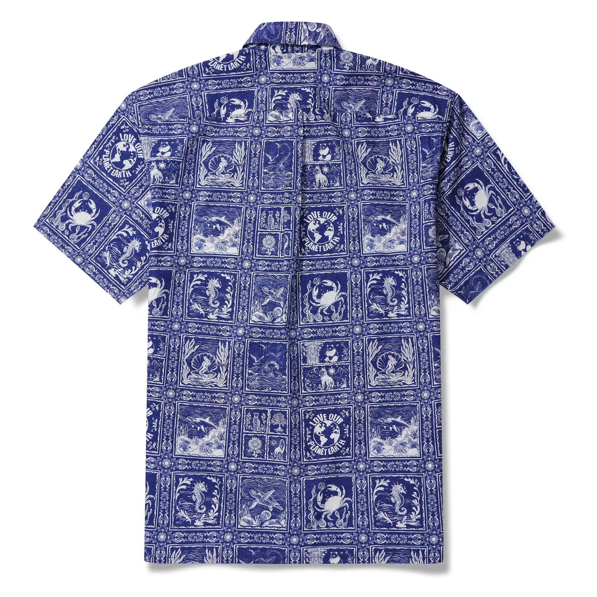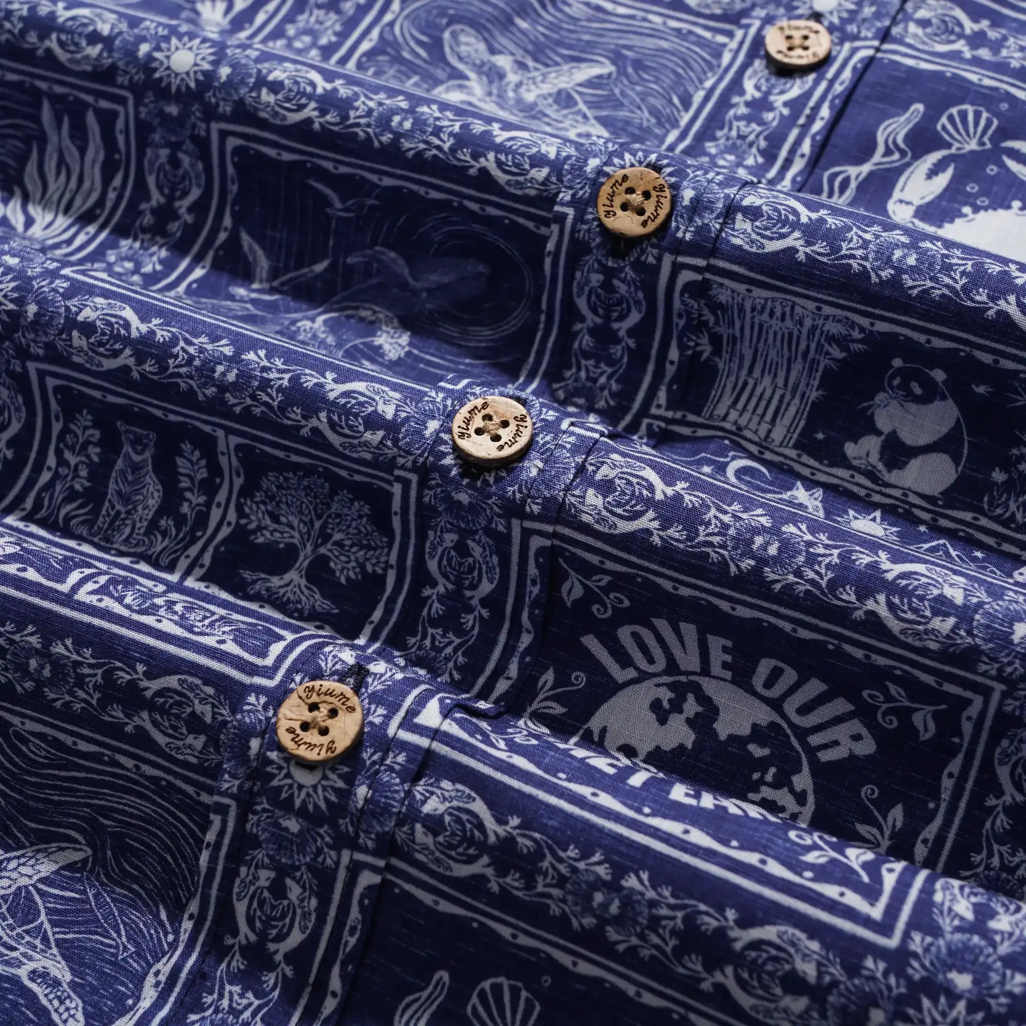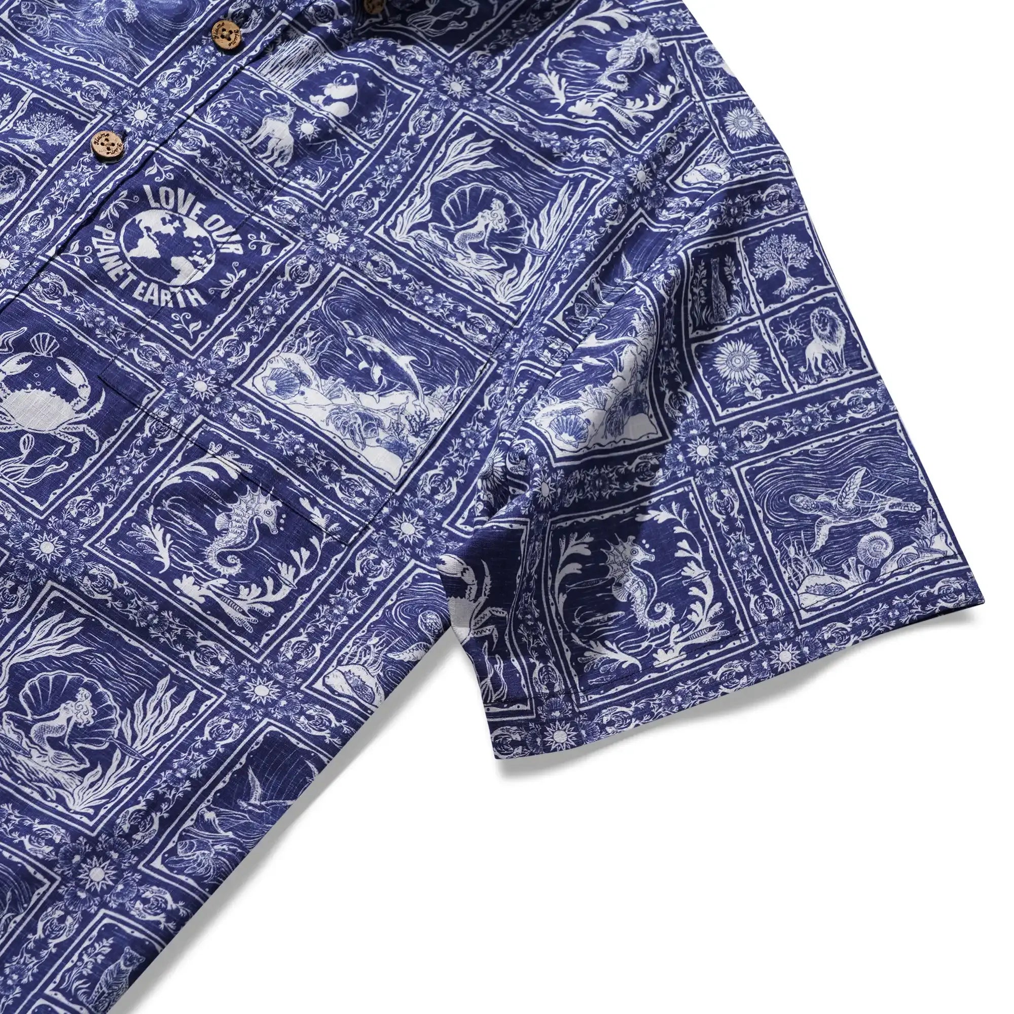 Men's Hawaiian Shirt Short Sleeve Button-down 100% Cotton Blue Aloha Endangered Animal Collage