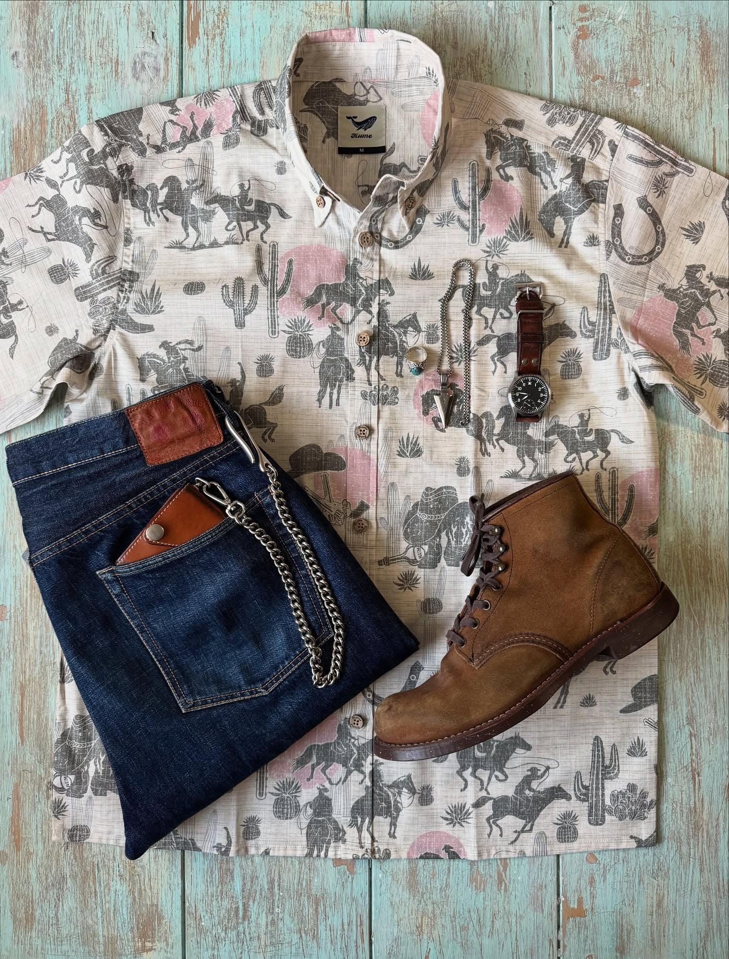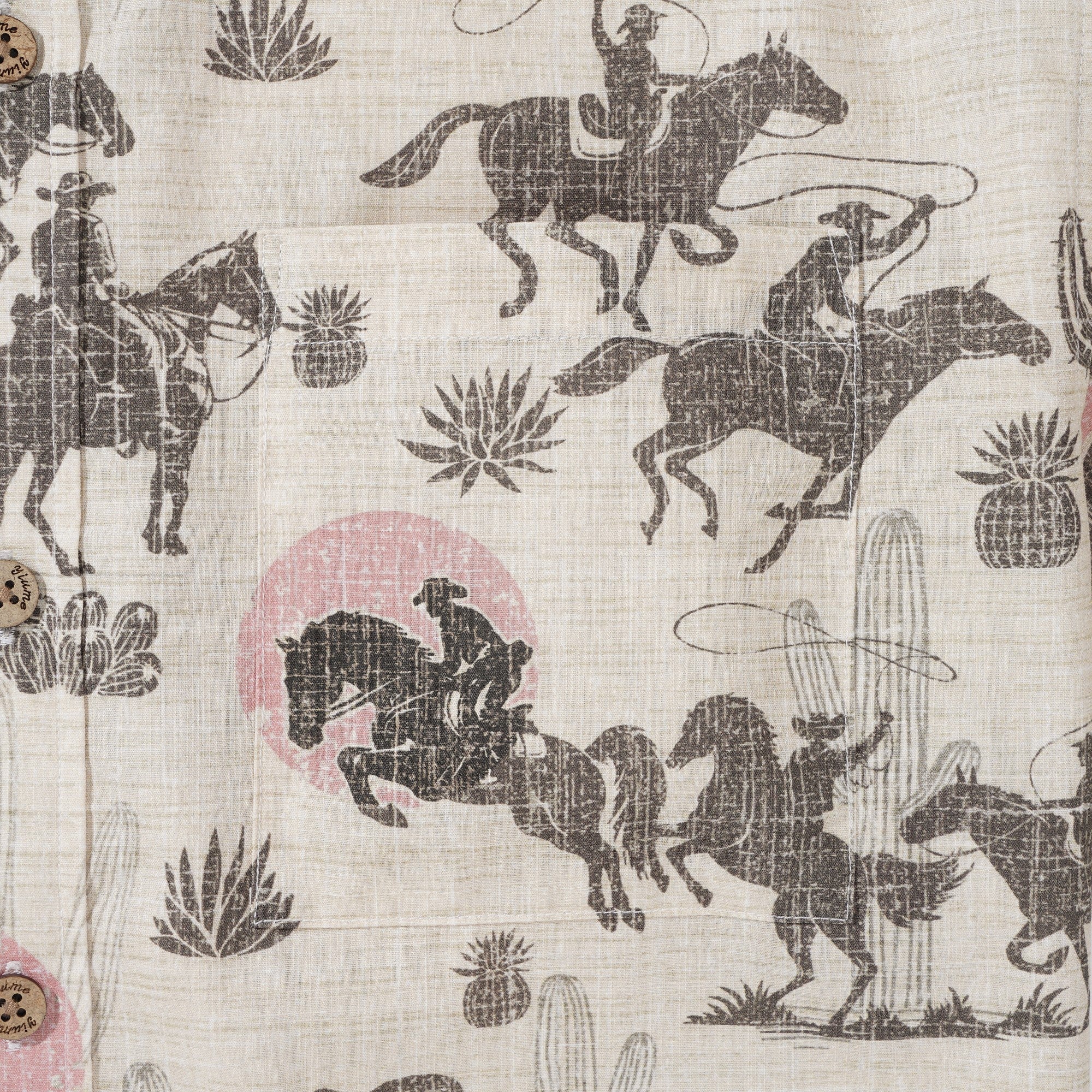 This artwork features a Western cowboy design on a light beige background, outlined in black. It showcases cowboys on horseback, lassoing, along with cacti, cowboy hats, saddles, horseshoes, and a pink sun motif for a lively touch. The scene exudes a mix of calm and motion, embodying the spirit of freedom and cowboy life.