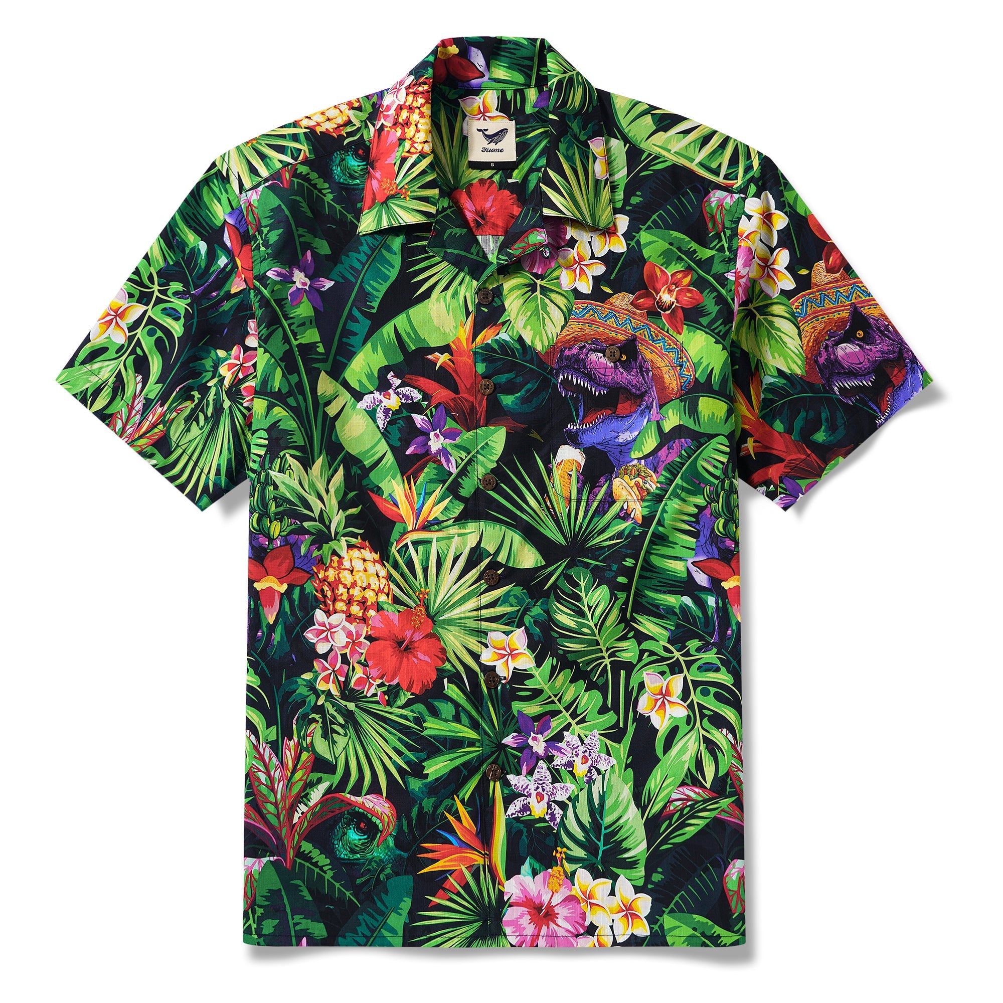 Immerse yourself in the lush greenery with a purple Tyrannosaurus rex sporting a Mexican sombrero, enjoying a corn tortilla and a refreshing drink. A hidden green dinosaur lurks nearby, surrounded by frangipani, hibiscus, and rare orchids. A blend of prehistoric fun and tropical vibes with pineapples and vibrant blooms. This shirt exudes a wild mix of dinosaur madness, party spirit, and jungle beauty – adding daring, playful bright colors to your style.