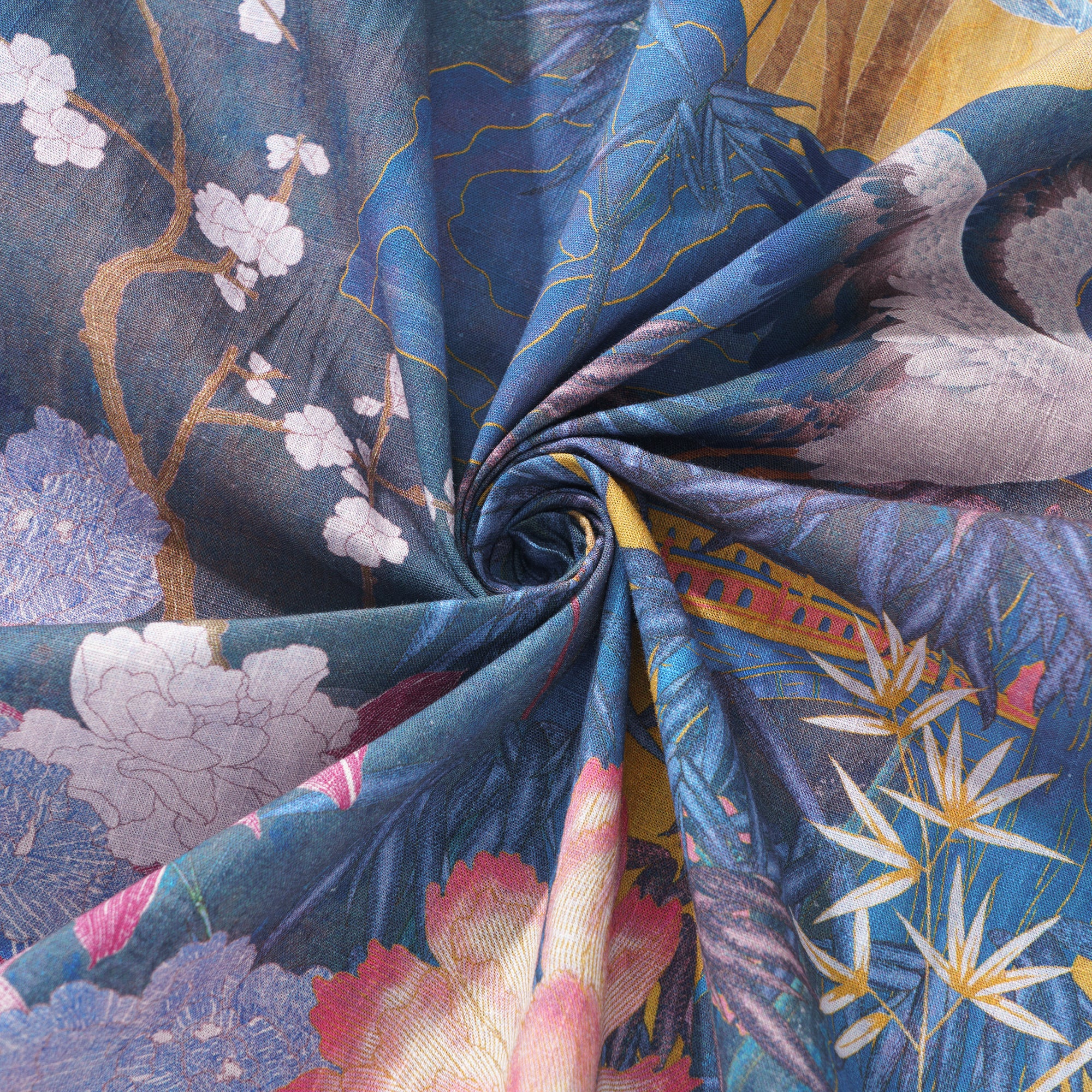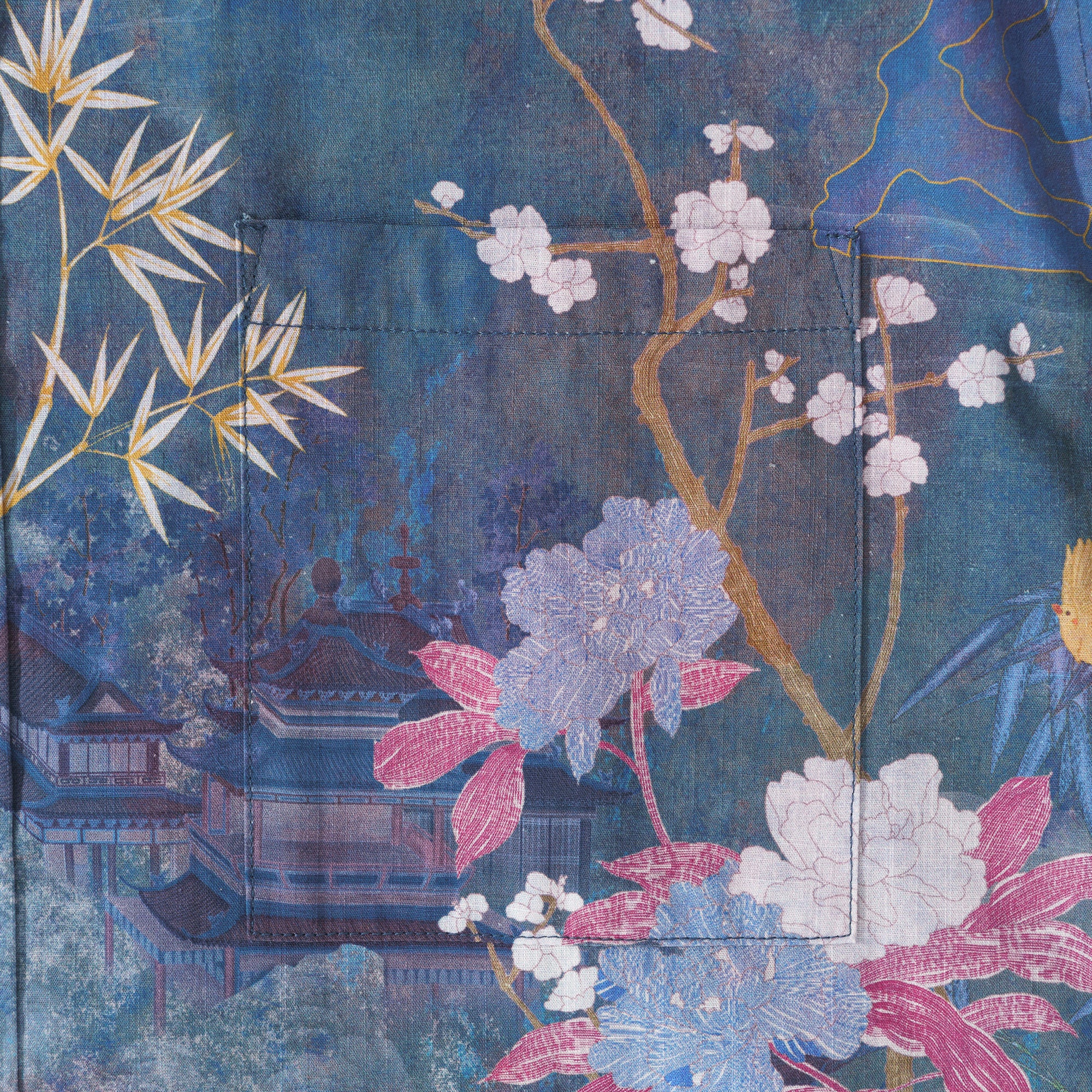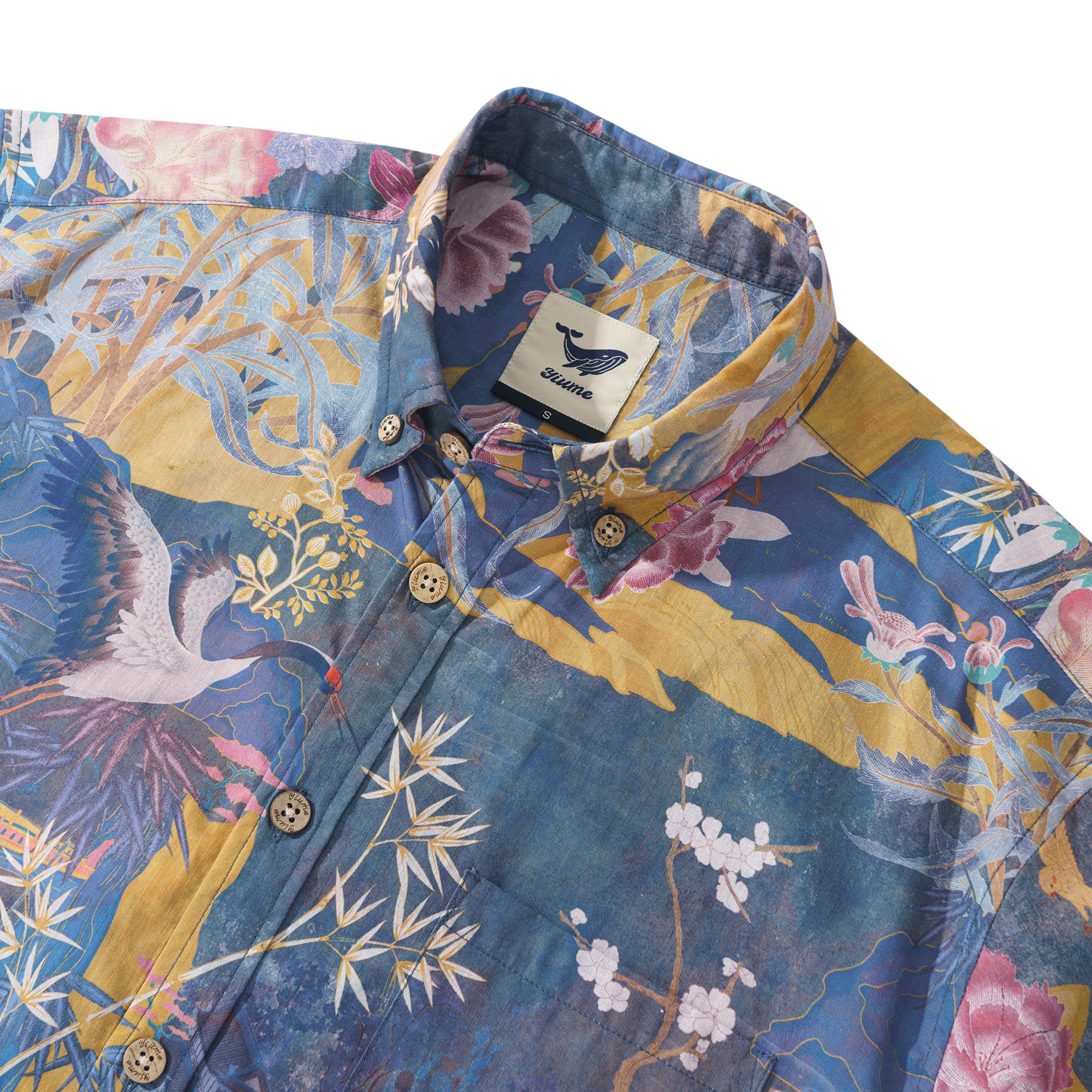 Introducing our latest design: a harmonious blend of traditional Chinese elements. The soft blue background symbolizes tranquility and elegance, reminiscent of a clear sky. Vibrant accents of red and yellow add energy and warmth to the piece. The graceful crane represents longevity and grace, while the ancient architecture and floral motifs bring a touch of history and beauty. This shirt is not just a work of art but a storytelling masterpiece of China's rich heritage. Wear it and carry a piece of ancient charm wherever you go.