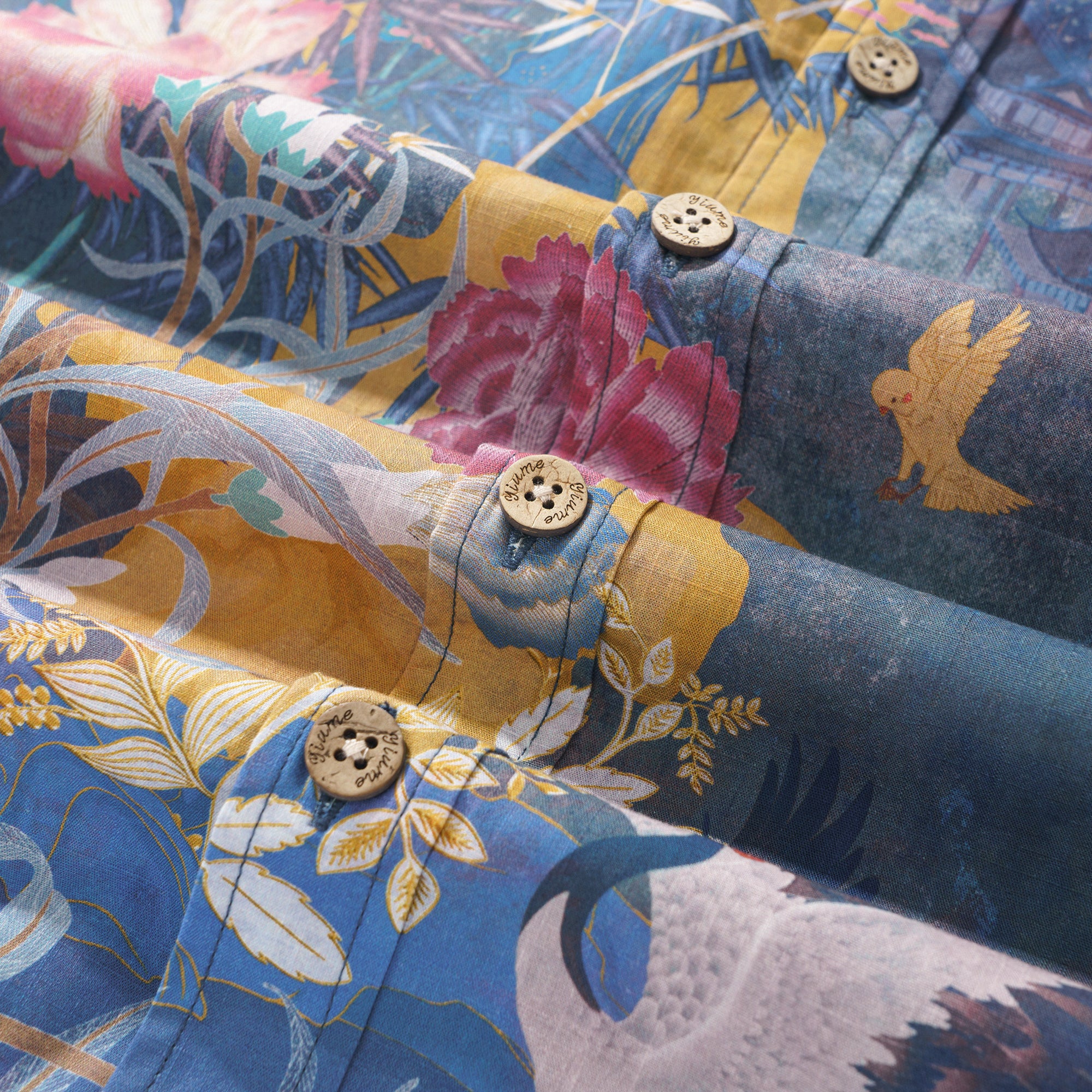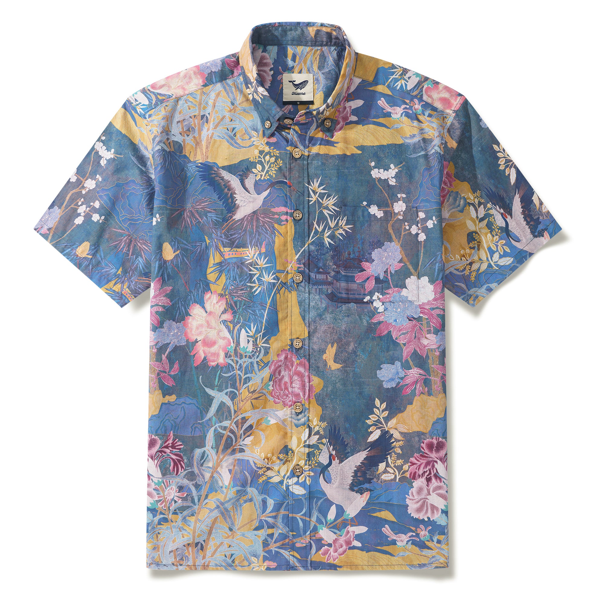 Pastel Oriental Tapestry - Elegant Chinese-Inspired Weaving 100% Cotton Men's Aloha Hawaiian Short Sleeve Button-down Shirt
