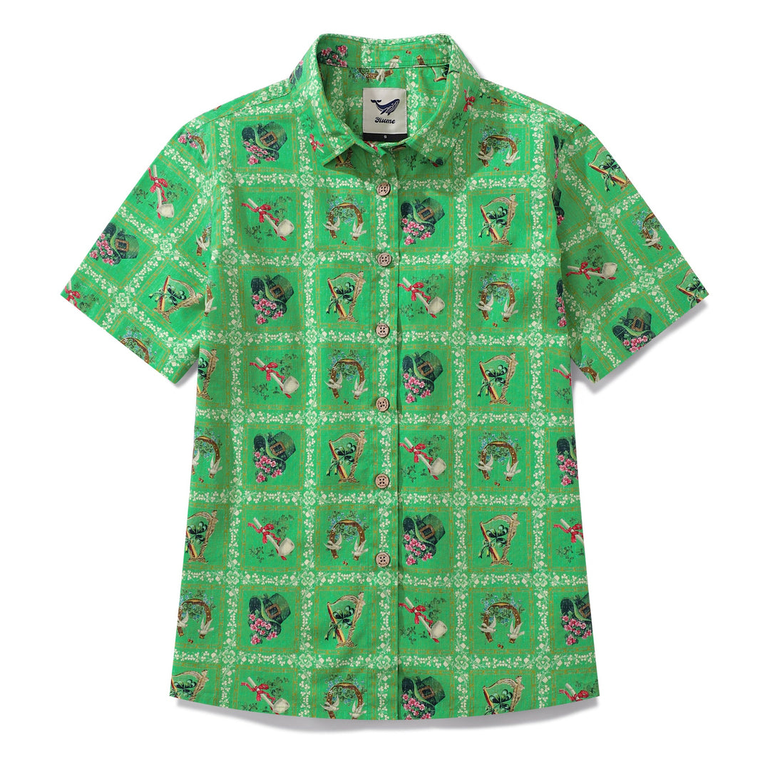 St. Patrick's Day Women's Hawaiian Shirt Green St. Patrick's Day Print Cotton Button-up Short Sleeve