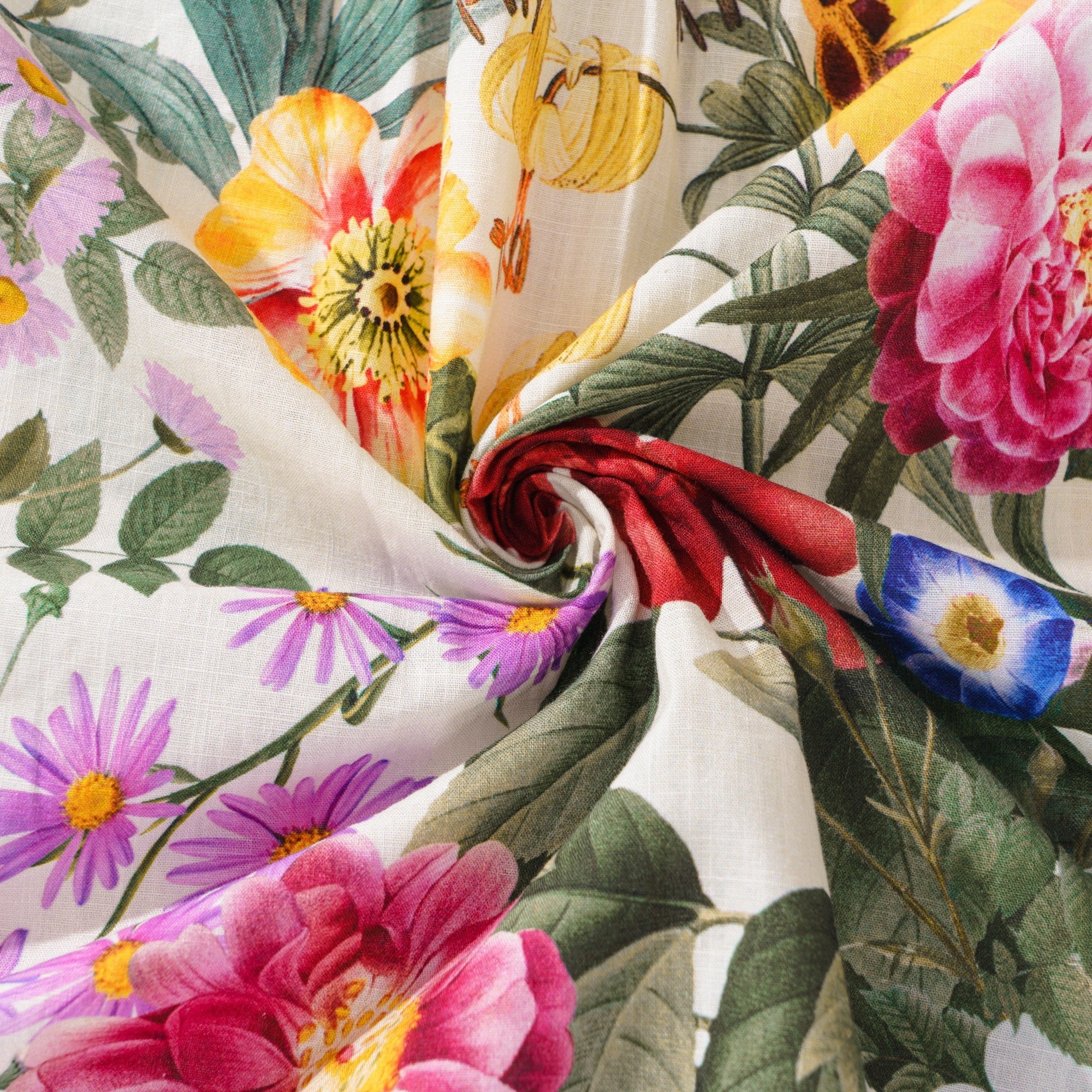 On a soft beige background, vibrant flowers bloom, creating a beautiful summer scene. The lifelike floral pattern exudes positivity and vitality, perfect for everyday casual wear or vacation adventures. This shirt promises a fresh and comfortable experience, uplifting the wearer with its joyful vibes.