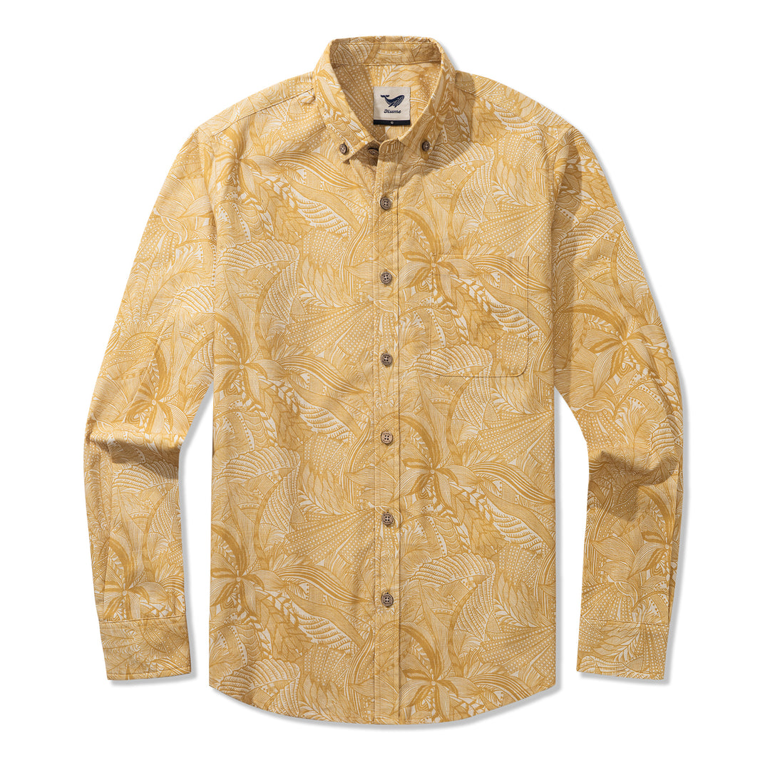 Tropical Golden Feather Dream 100% Cotton Men's Long Sleeve Button-down Shirt Aloha Hawaiian