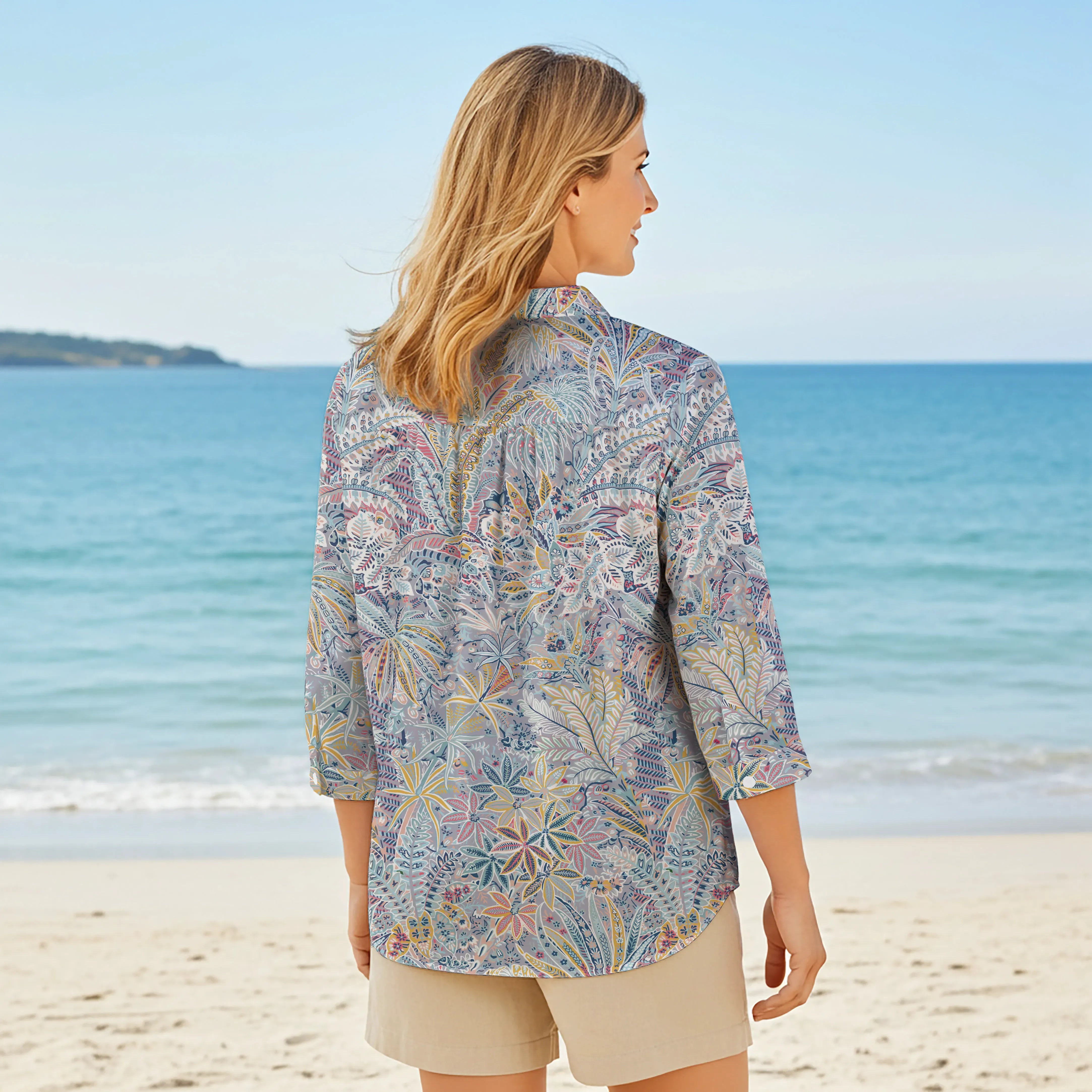 Women Casual Blouse 3/4 Sleeve V-neck Shirt Collar 100% Lyocell Gray Aloha Jungle