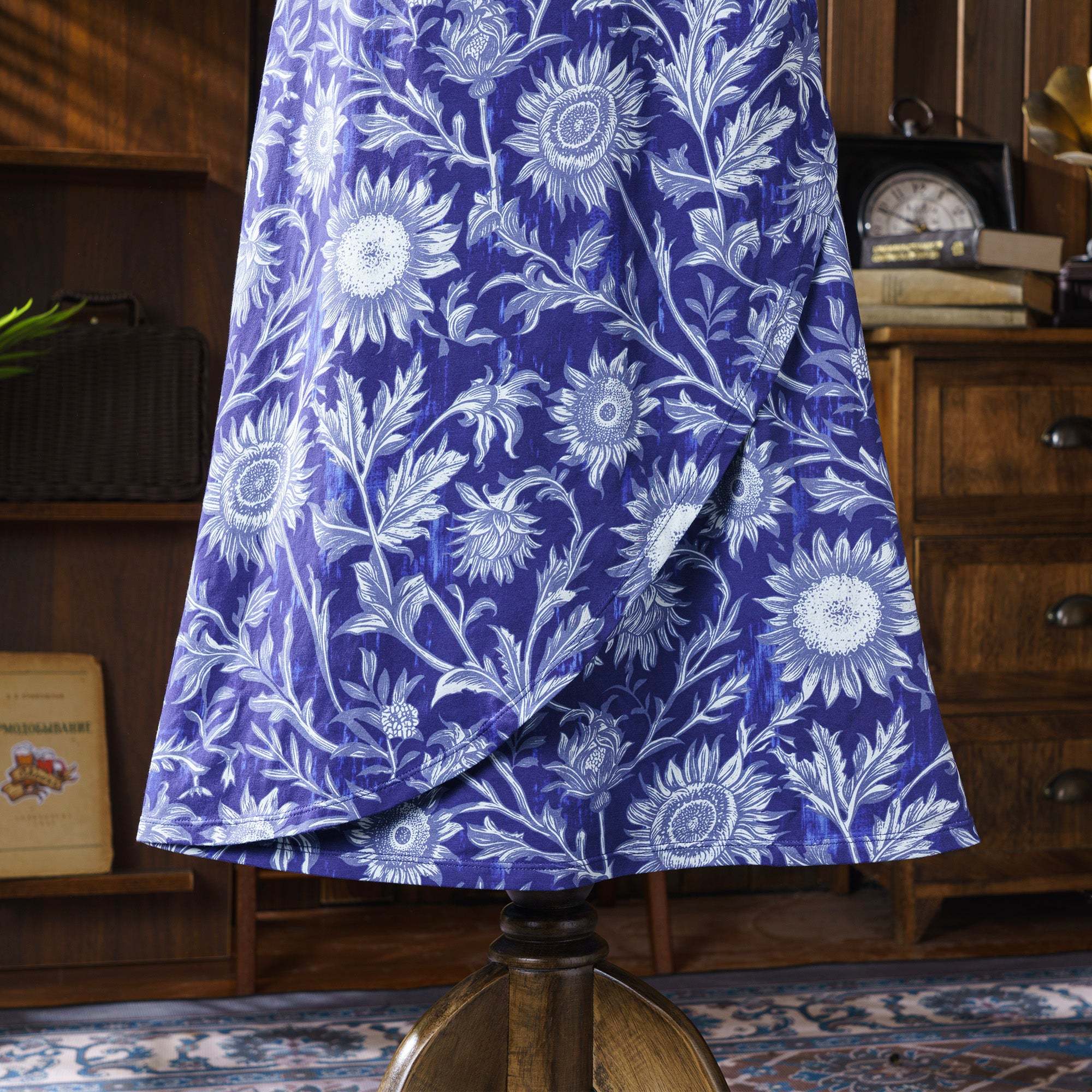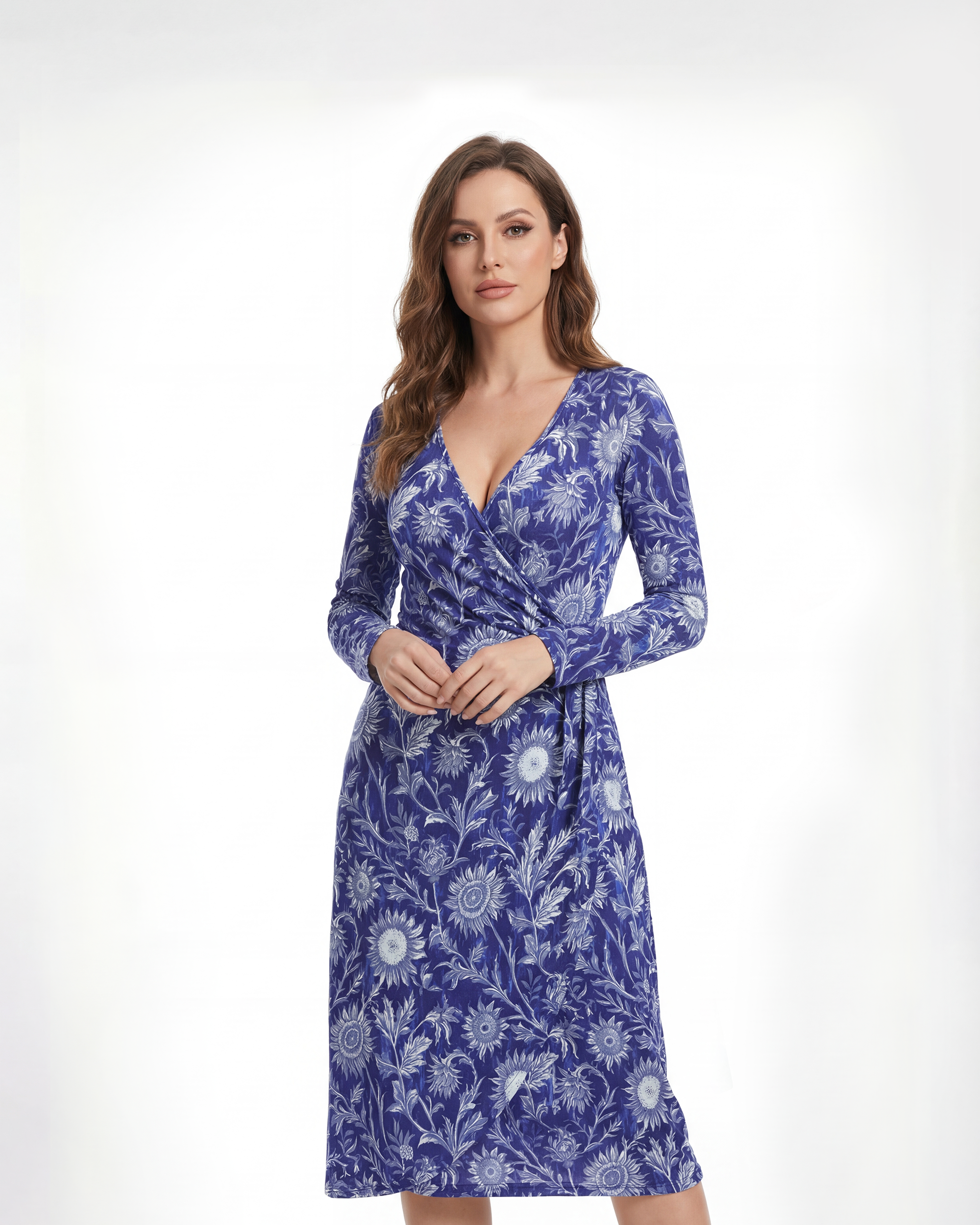 Women Hawaiian Dress Blue and White Porcelain Sunflower V-Neck Long Sleeve Dress